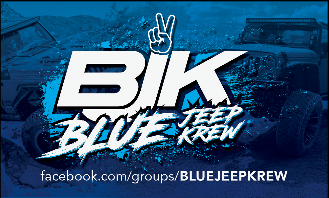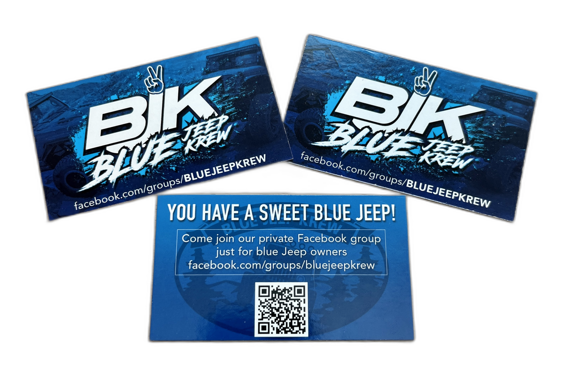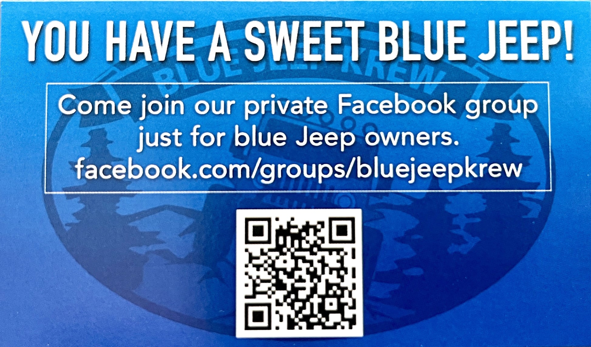 Invite other blue Jeepers to join Blue Jeep Krew. We now have Blue Jeep Krew "Come Join Us" cards available to put on a blue Jeep when you see them around town. All blue Jeeps are welcome! These are perfect for fitting under windshield wipers or on windows of fellow blue Jeep owners.