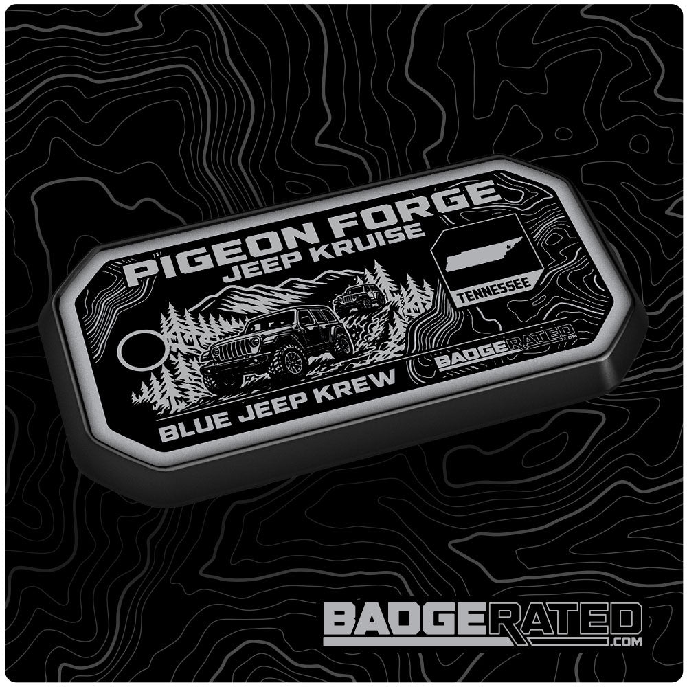 ❗️Now available ❗️Limited Edition "Blue Jeep Krew Pigeon Forge Jeep Kruise" badge. Made in a similar style and size as the badge of honor style badges, this is made from laser-engraved powder coated aluminum with a 3M adhesive backing. Approximately 2 7/8" wide x 1 9/16" tall.